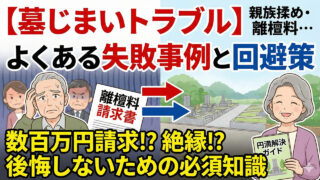 墓じまい 【墓じまいトラブル】親族揉め・離檀料…よくある失敗事例と回避策 「子孫に迷惑をかけたくない」その一心で決意した墓じまいが、まさか親族をバラバラにし、数百万円もの請求書を突きつけられる悪... 2026.02.16 墓じまい