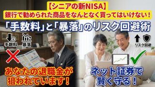 新NISA 【シニアの新NISA】銀行で勧められた商品をなんとなく買ってはいけない!「手数料」と「暴落」のリスク回避術 「お客様だけに特別なご案内です」 銀行の窓口でその言葉を聞いたら、すぐに耳をふさいでください!あなたの大切な退職金や老後... 2026.02.12 新NISA老後資金
